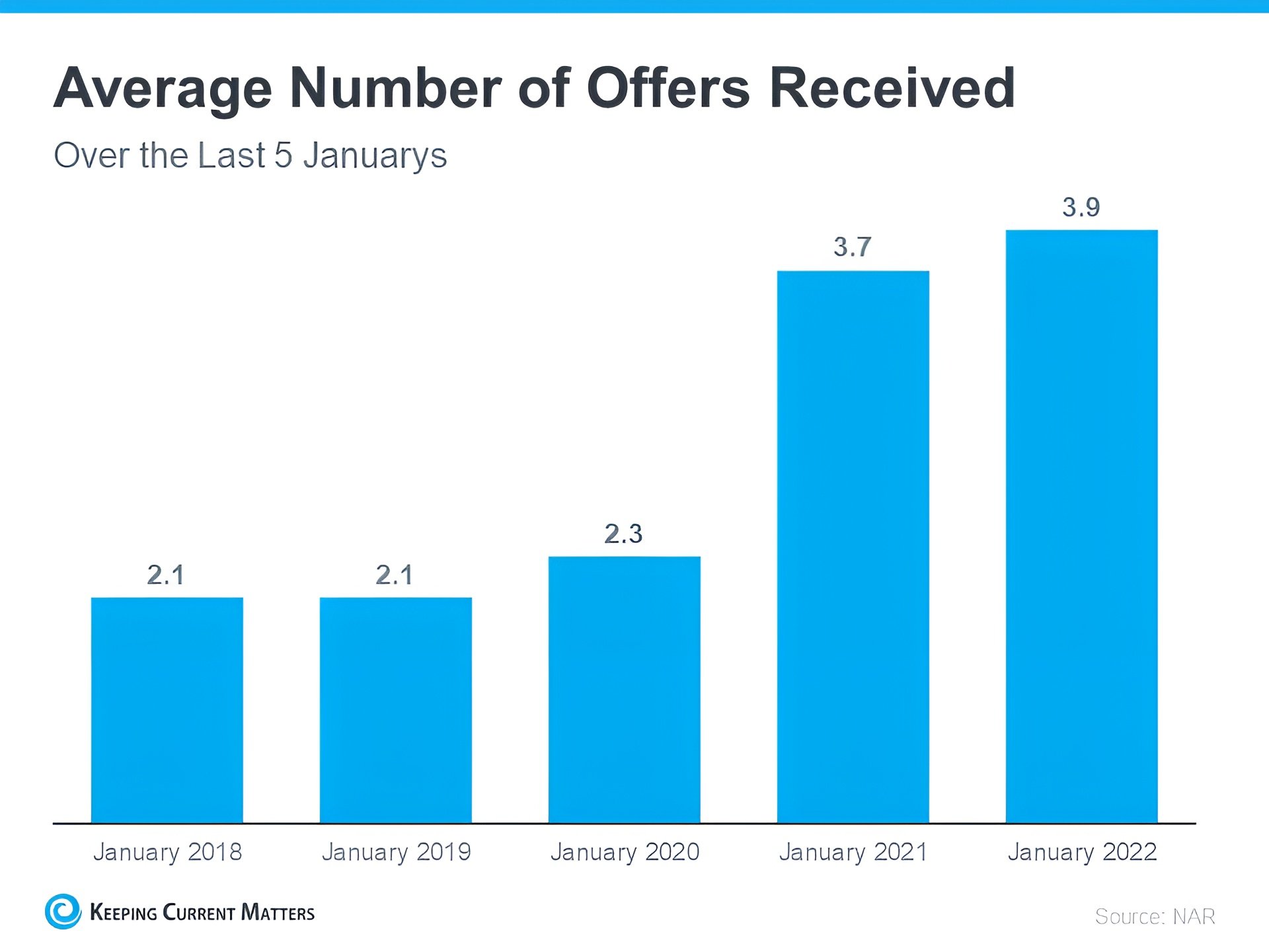 When the market is strong and you are looking for a property in a popular price range or highly sought-after area, you might find yourself in a multiple offer situation. The National Association of REALTORS® reported that in early 2021 & 2022, nearly 4 offers were made for every home sold. According to the latest REALTORS® Confidence Index from the National Association of REALTORS® (NAR), homes today are receiving an average of 3.9 offers. That’s the most offers we’ve seen in January for the last 5 years (see graph below). It’s time for buyers to get comfortable with competing against multiple offers!