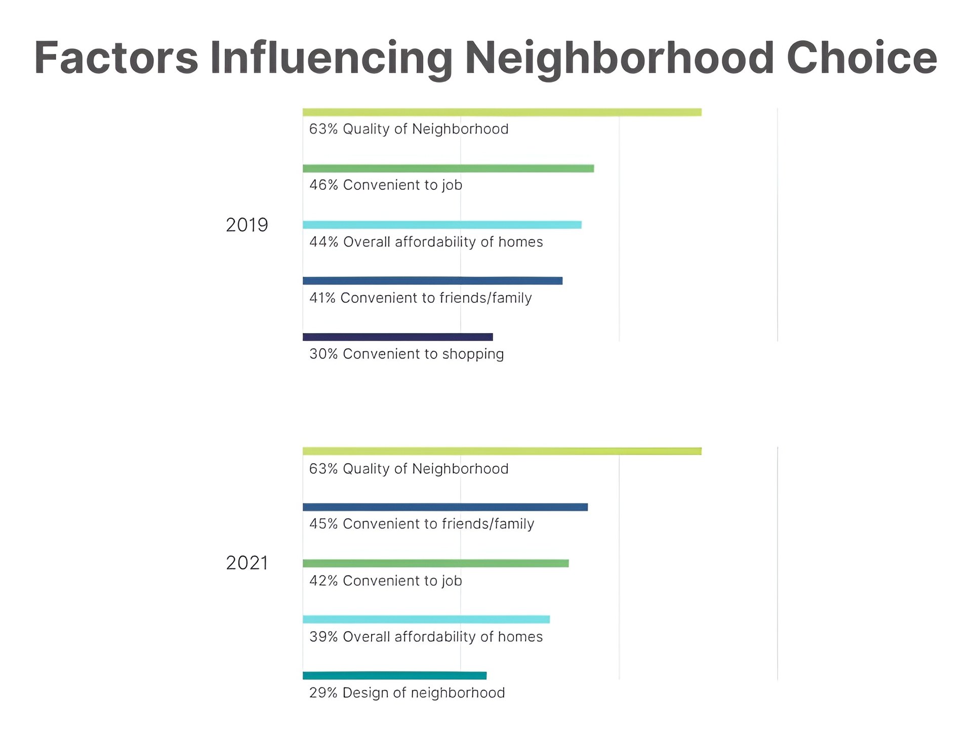 Deciding where to live is one important factor for buyers that has shifted since the pandemic. The quality of the neighborhood is still buyers’ top priority by a margin of 18%. Finding a home close to friends and family now comes in the second spot. Convenience to jobs has now moved to 3rd. Despite the escalation in home prices, affordability of homes is 4th overall. However, single buyers were more concerned about affordability than married couples.