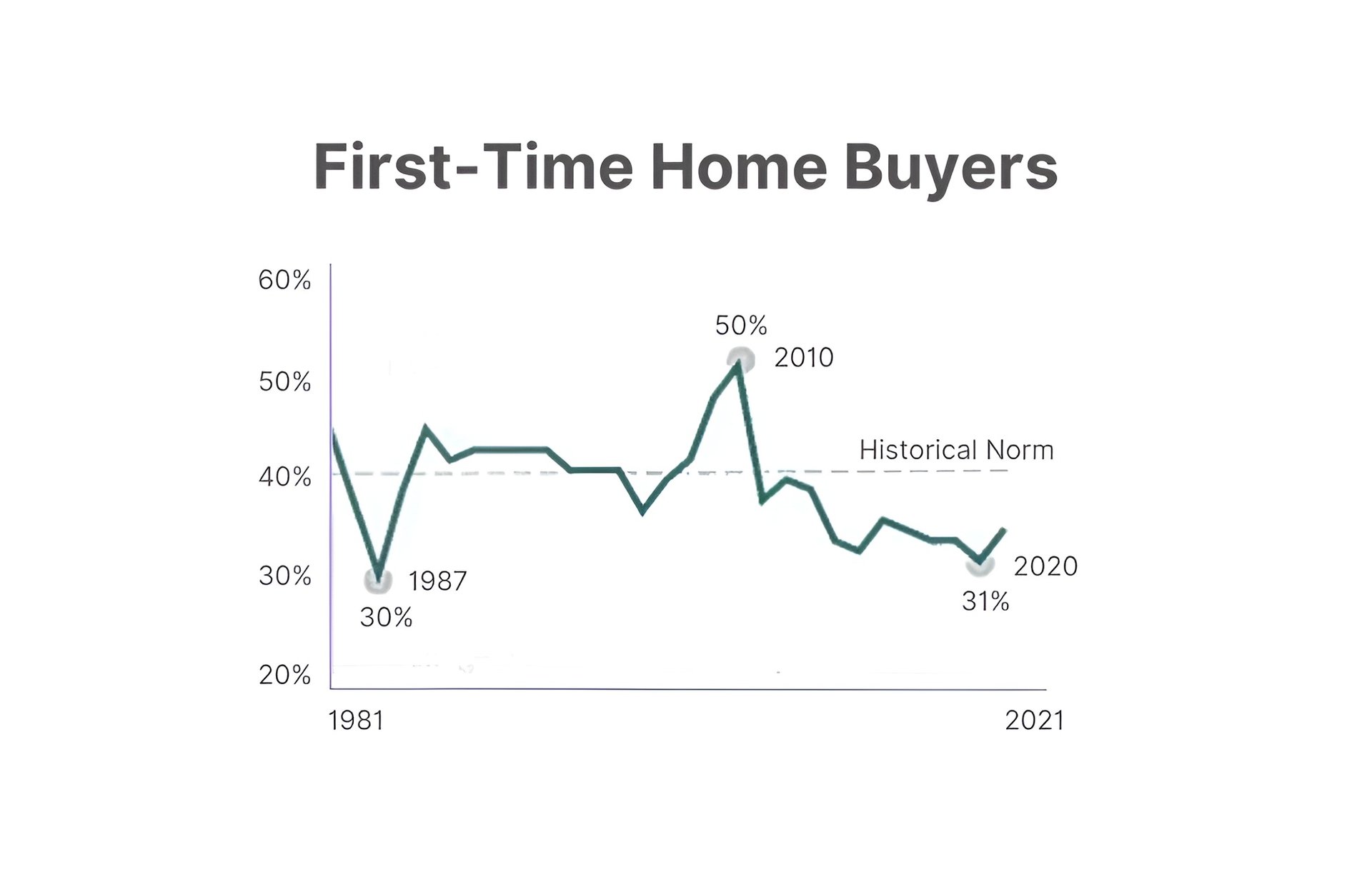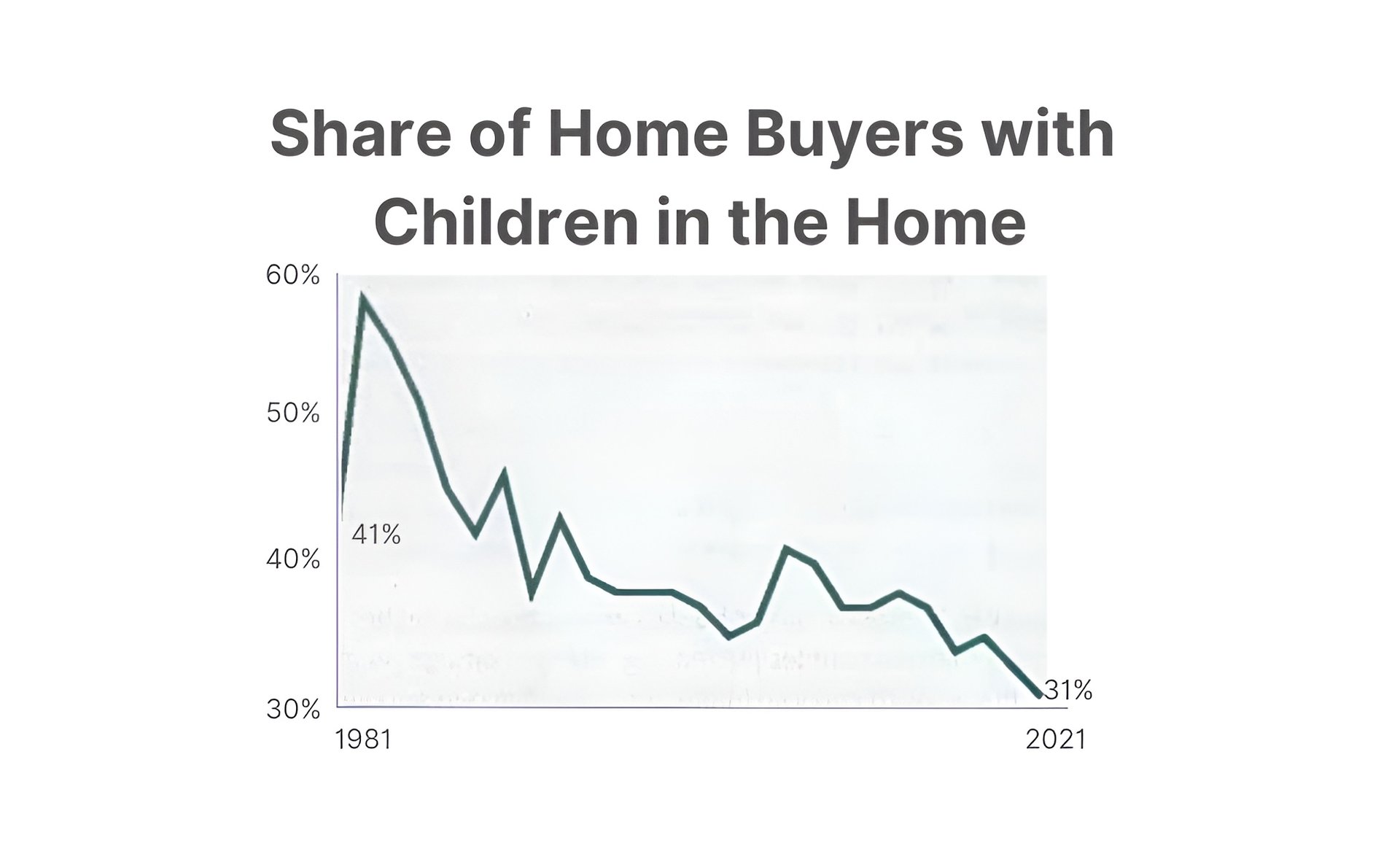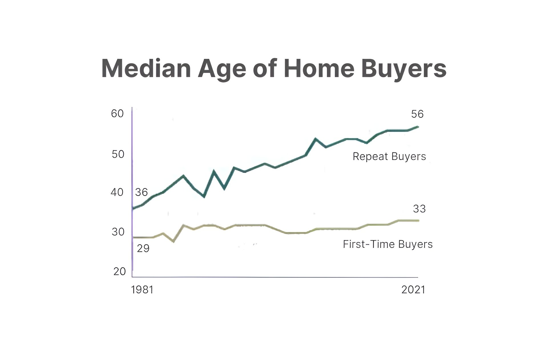 Compared to 1981, the median age of homebuyers in notably higher, rising from 31 to 45 years old. In addition, repeat buyers reached a record high of age 56 in 2021.
