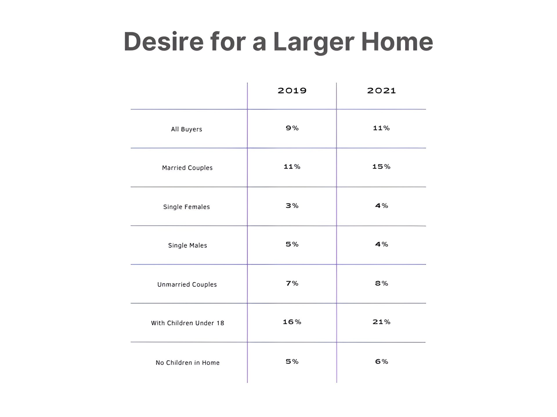 Much has been said since the onset of the pandemic about buyers seeking bigger houses to help them manage the reality of spending more time at home. Longing for more space has grown in importance for buyers, collectively, since 2019. Over the past two years, this factor moved up one position and became buyers’ second-highest priority behind the sheer desire to be a homeowner. Interest in larger houses was noticeably higher among married couples and buyers with children compared to other buyers.